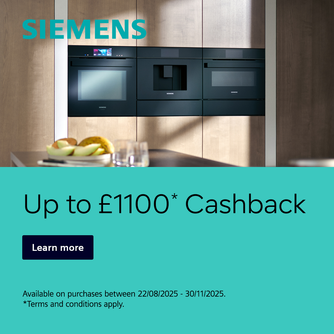 • £1000 cashback will be offered with a purchase of 7 qualifying Siemens kitchen appliances including an oven.
